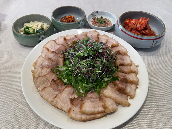 Bossam (보쌈) is a traditional Korean dish consisting of tender, boiled pork with our family seasonings that is typically served with various accompaniments and wrapped in leafy greens